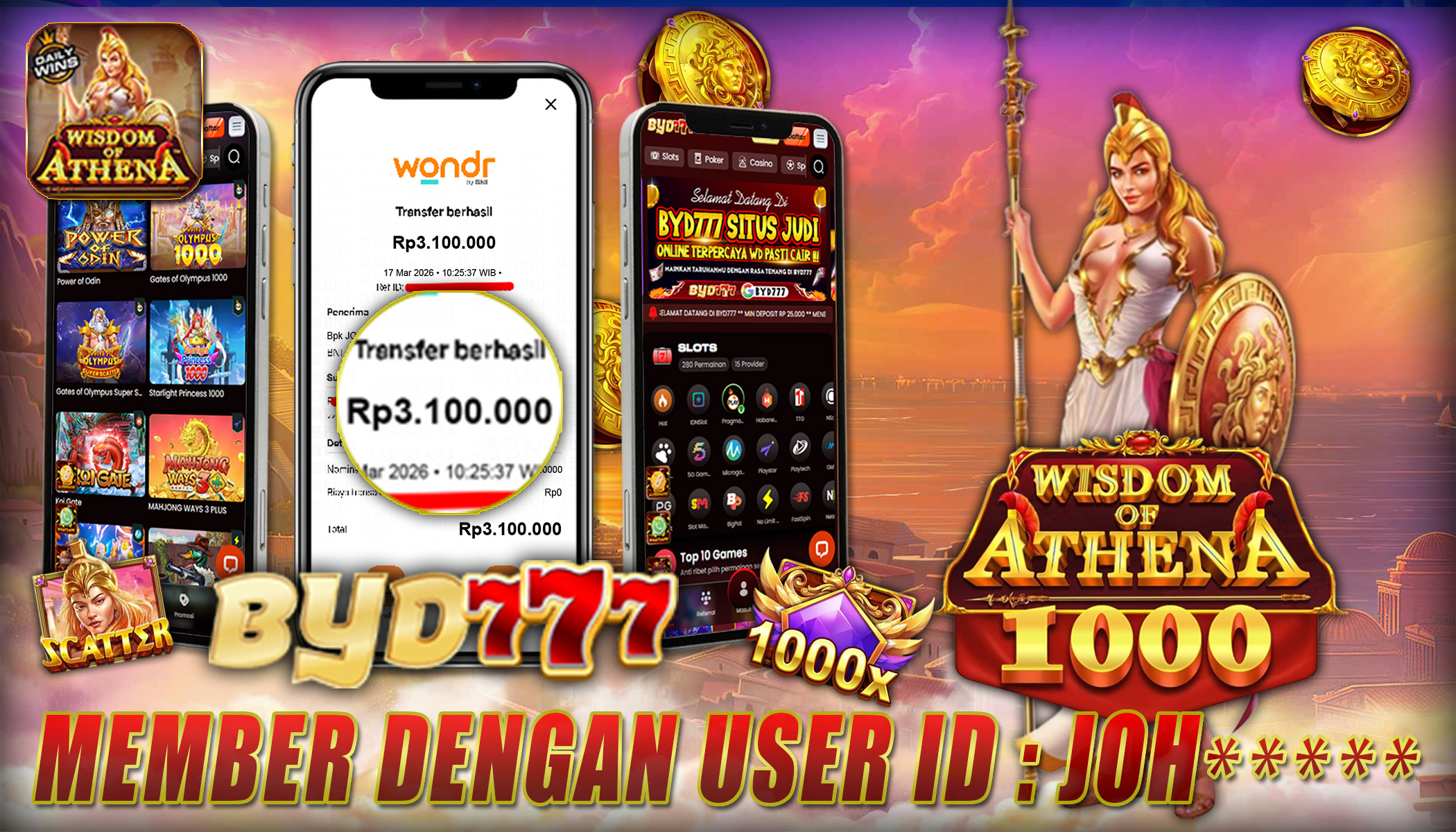 Seorang pemain setia di BYD777 dengan ID : JOH***** baru saja menikmati kemenangan manis setelah berhasil mendapatkan jackpot di game Wisdom of Athena senilai Rp 3.100.000. Tidak butuh waktu lama, dana langsung diproses dan dinyatakan lunas masuk ke akun member tanpa hambatan. Hal ini kembali membuktikan komitmen BYD777 dalam memberikan pelayanan cepat dan aman.