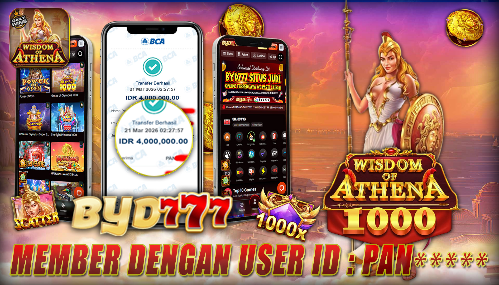 Seorang pemain setia di BYD777 dengan ID : PAN***** baru saja menikmati kemenangan manis setelah berhasil mendapatkan jackpot di game Wisdom of Athena senilai Rp 4.000.000. Tidak butuh waktu lama, dana langsung diproses dan dinyatakan lunas masuk ke akun member tanpa hambatan. Hal ini kembali membuktikan komitmen BYD777 dalam memberikan pelayanan cepat dan aman.