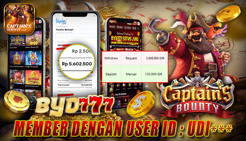 Pemain setia di BYD777 dengan user id : UDI***** baru saja menikmati kemenangan manis setelah berhasil mendapatkan jackpot di game Captain’s Bounty senilai RP. 5.600.000. Tidak butuh waktu lama, dana langsung diproses dan dinyatakan lunas masuk ke akun member tanpa hambatan. Hal ini kembali membuktikan komitmen BYD777 dalam memberikan pelayanan cepat dan aman.