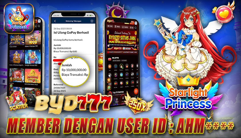 Pemain setia di BYD777 dengan user id : AHM***** baru saja menikmati kemenangan manis setelah berhasil mendapatkan jackpot di game Starlight Princess senilai Rp 10.000.000. Tidak butuh waktu lama, dana langsung diproses dan dinyatakan lunas masuk ke akun member tanpa hambatan. Hal ini kembali membuktikan komitmen BYD777 dalam memberikan pelayanan cepat dan aman.